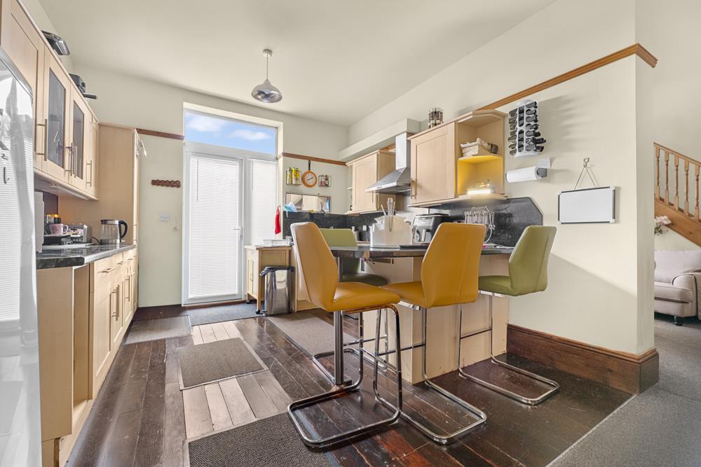 Kitchen - 4.57m 2.74m x3.51m (15' 9 x11'6) - Electric heater, Shaker design kitchen units comprise base cupboards and drawers, working surfaces over, inset stainless steel sink and drainer. Breakfast bar, eye level wall mounted cupboards, plumbing for automatic washing machine. Fitted appliances include electric ceramic hob, electric double oven, stainless steel splashback and extractor, uPVC double glazed front entrance door.