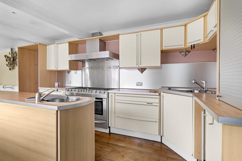 Open Plan Living Accommodation - 6.40m x 3.68m (21' x 12'1) - Velux roof lights, circular gable end windows, two electric heaters. Kitchenette with range of modern fitted kitchen units comprising base cupboards, working surfaces above, inset sink and drainer. Integral appliances include oven and hob. Mosaic style tiling to splashbacks, vaulted ceiling.
