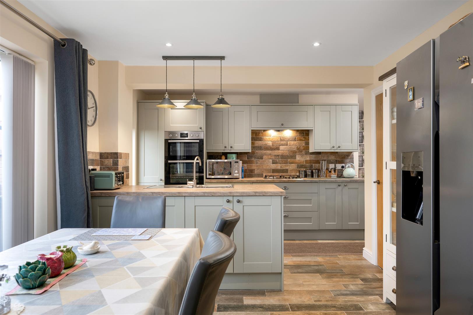 Kitchen Area - 3.71m x 1.45m (12'2 x 4'9 ) - Fitted with a range of painted shaker design kitchen units comprising base cupboards and drawers including deep pan draws, working surfaces over with inset stainless steel one and a half bowl sink and drainer. Integral appliances include Zanussi electric double oven, gas hob and a Lamona dishwasher. Brick effect tiling to splashbacks, tall storage cupboard, wall mounted cupboard. UPVC double glazed rear entrance door, LED downlights. Open plan to family room.