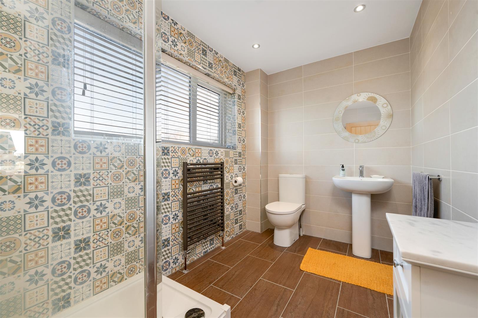 En Suite - 3.25m x 1.91m (10'8 x 6'3 ) - Well appointed with a modern white suite comprising low suite WC, pedestal wash hand basin, double shower cubicle with glass screen and flipper door, wall mounted rain and hand shower. UPVC double glazed window to rear elevation, wall mounted towel radiator, central heating radiator, fully tiled walls including a feature wall with designer tiles, LED ceiling lights, loft access hatch.