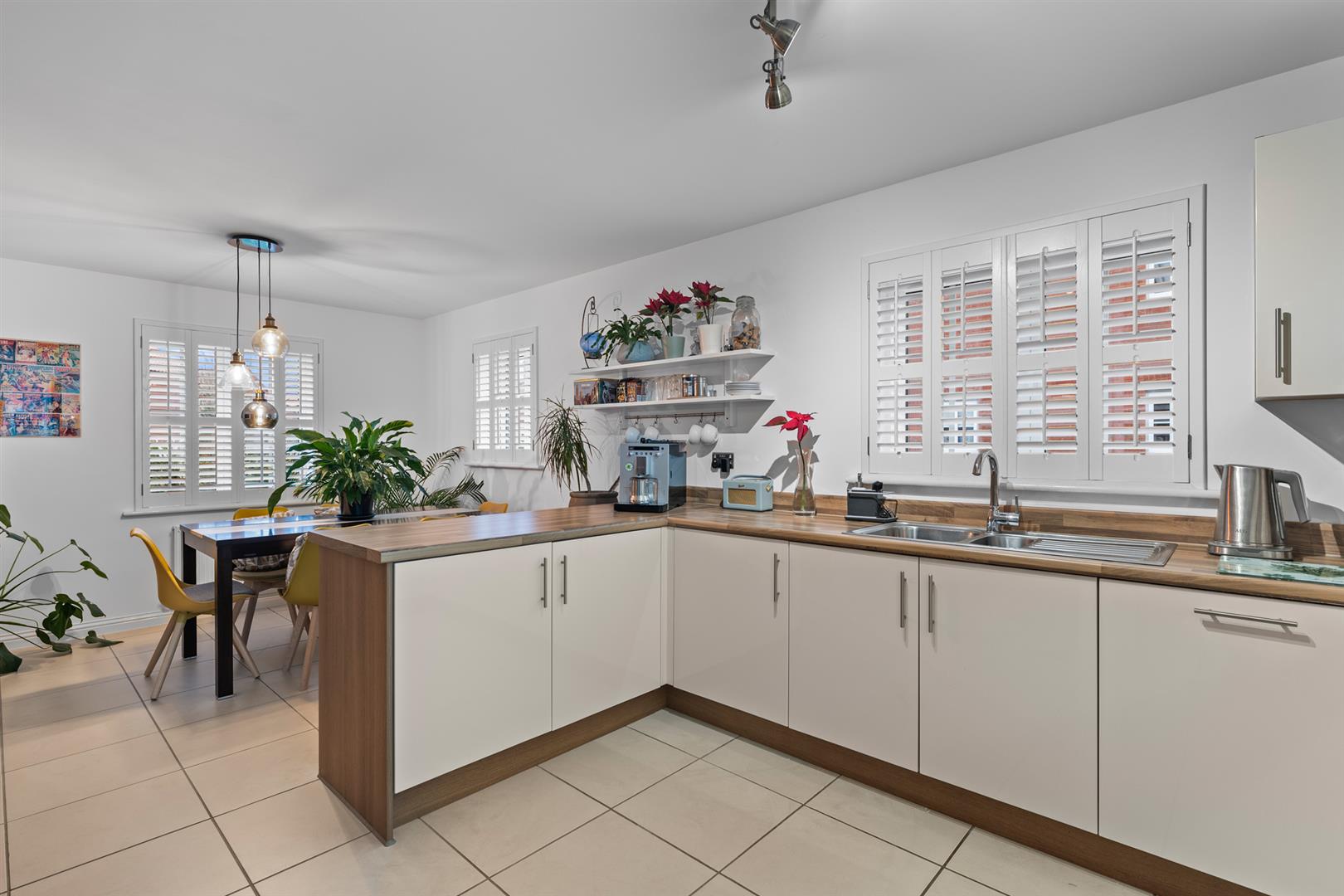 Open Plan Living/Dining Kitchen - 6.53m x 3.53m (21'5" x 11'7") - A well proportioned, light and airy, open plan space which benefits from windows to three elevations including a pleasant aspect across to a central green. The room is large enough to accommodate both a living and dining space which in turn is open plan to a kitchen fitted with a generous range of contemporary gloss fronted wall, base and drawer units with brush metal fittings and under unit lighting; a U shaped configuration of butchers block effect laminate preparation surfaces providing an excellent level of working area; inset sink and drain unit with chrome swan neck mixer tap; integrated appliances including Zanussi four ring stainless steel finished gas hob with stainless steel splash back and chimney hood over, Zanussi fan assisted oven and dishwasher; continuation of the filed floor, ceiling light points and a further door leading through into: