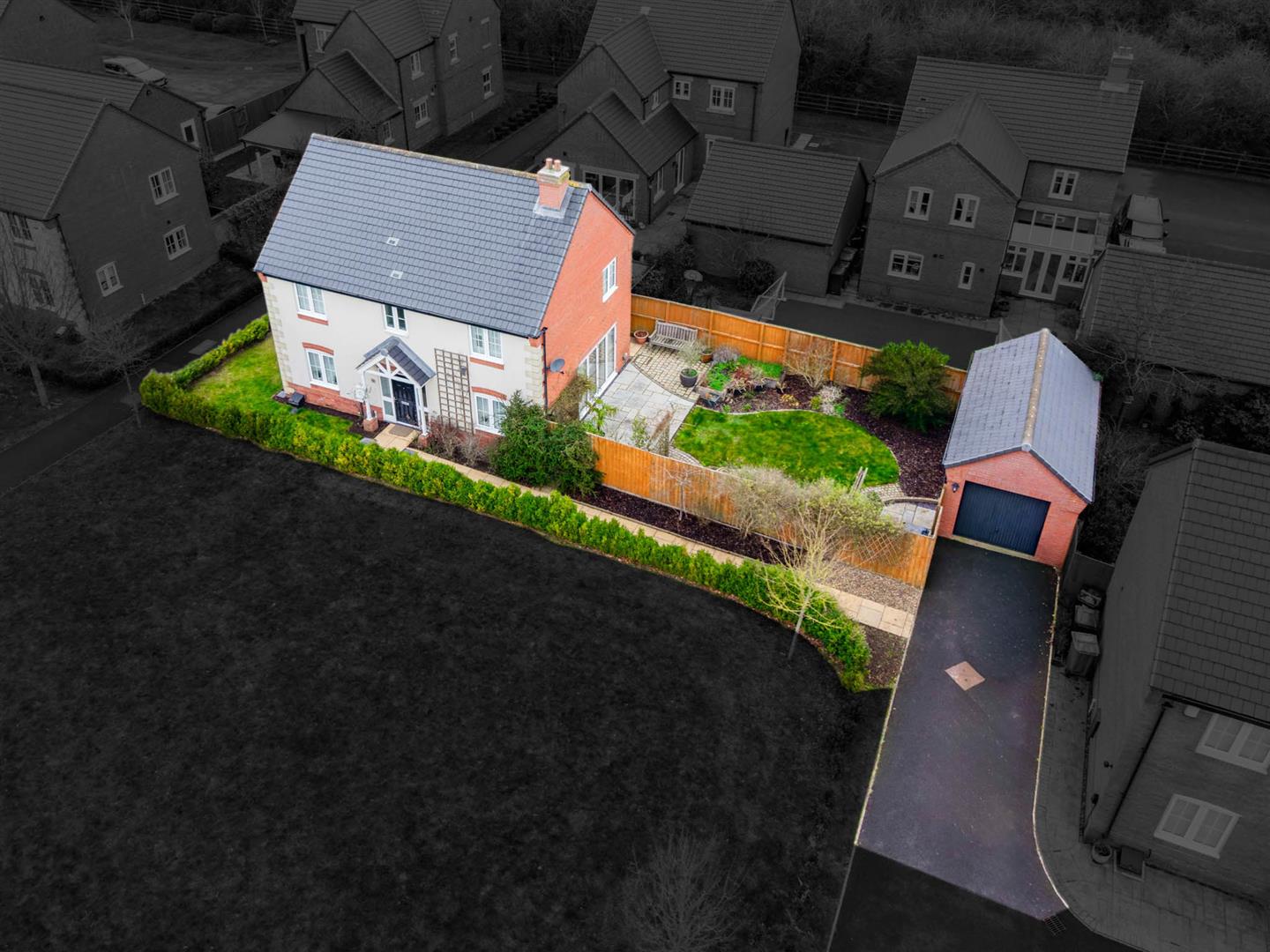 Exterior - The property occupies a delightful and secluded position, tucked away at the heart of this established development and benefitting from a pleasant open aspect across to a neighbouring green providing an attractive approach to the house. To the side of the property is a driveway providing off road car standing and which, in turn, leads to a detached brick built garage with up and over door. A timber courtesy gate leads into an enclosed, landscaped, garden with feather edged board fencing, central lawn with block set edging and well stocked established borders. This in turn leads up to a flagged terrace which links, via bifold doors, into the main reception. To the rear of the property is an additional area of garden enclosed by feather edged board fencing.