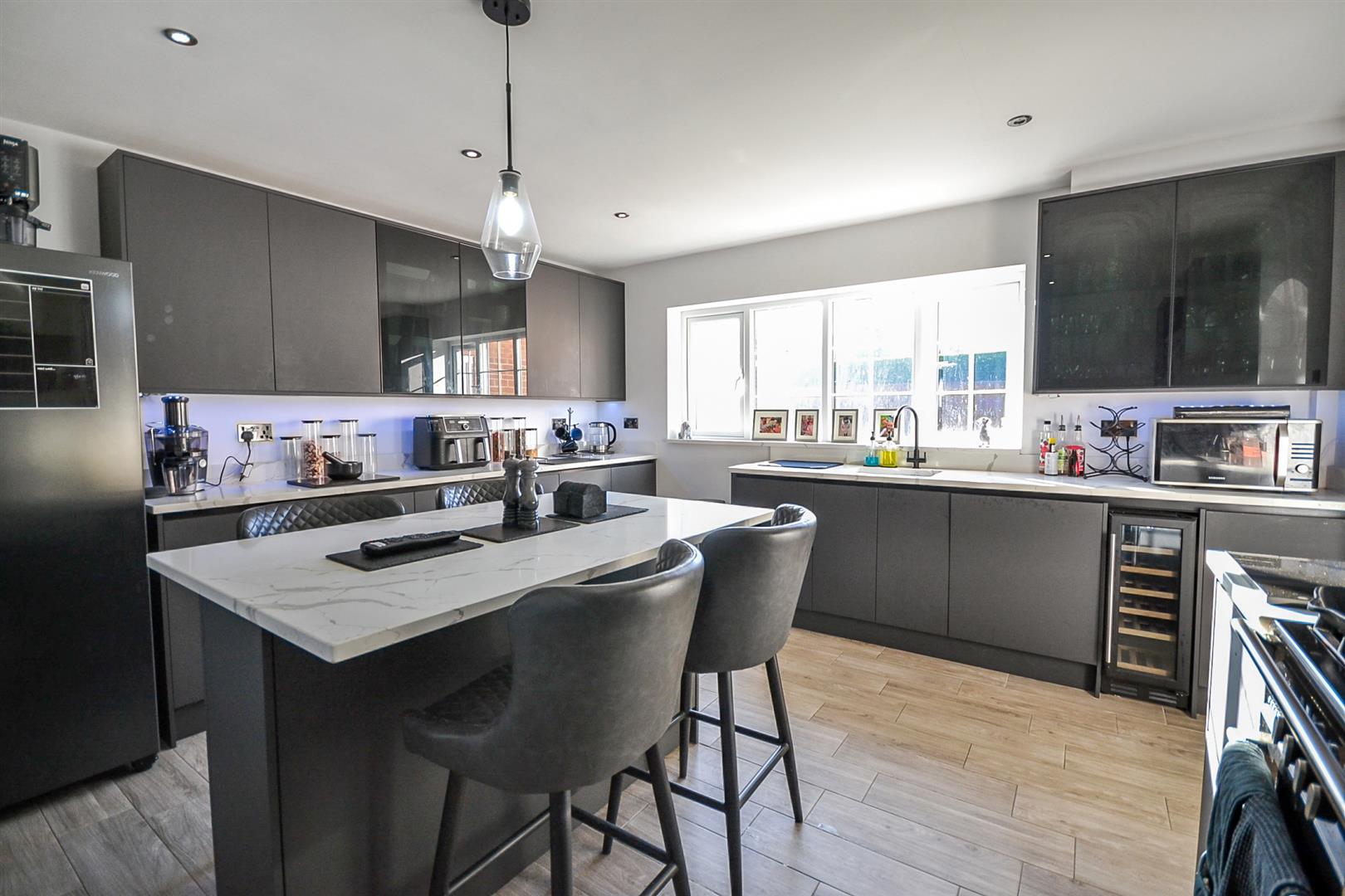 Dining Kitchen - A superbly fitted dining kitchen including a range of matt black handleless base and wall cabinets topped with Quartz worktops and upstands and including an island unit with breakfast bar seating. There is an undermounted 1.5 bowl ceramic sink with mixer tap, an integrated dishwasher plus space for further appliances including a recess for a range-style cooker with extractor hood over. Spotlights to the ceiling, an anthracite contemporary style central heating radiator, timber effect tiled flooring, a uPVC double glazed window to the rear aspect and an arch into the side hallway.