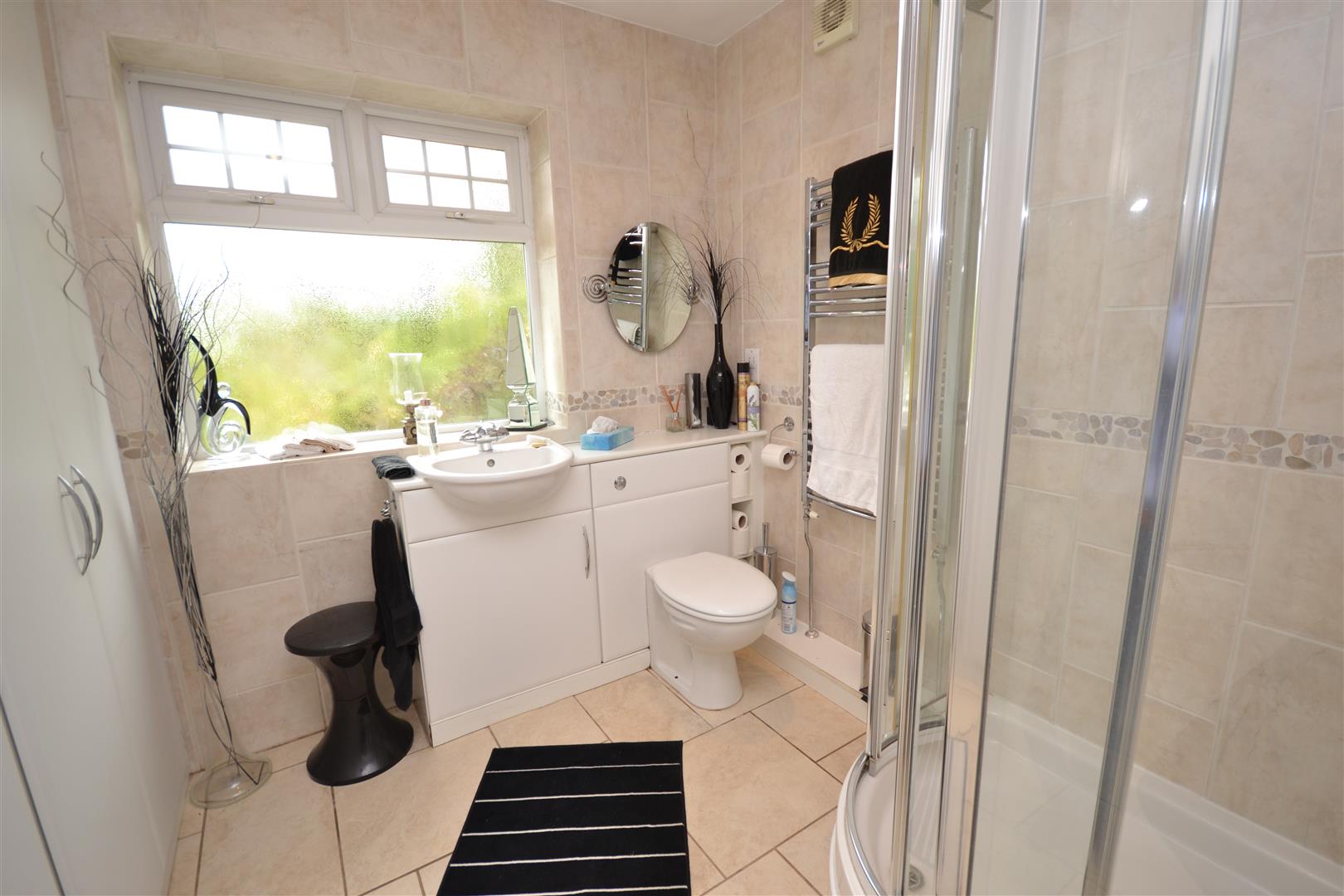 Shower Room - 2.59m x 2.46m (8'6" x 8'1") - This ground floor shower room is fully tiled to the walls and floor and fitted with a modern three piece white suite with chrome fittings including a wc with soft close seat and a wash basin with mixer tap both inset to a vanity unit, a large corner shower with a glazed and chrome sliding enclosure and a chrome thermostatic shower fitment. A run of tall built-in storage cupboards with shelving, clothes rail and housing the Baxi gas central heating combi boiler, chrome heated towel rail, shaver point, extractor fan, recessed ceiling downlights and obscure window to rear.