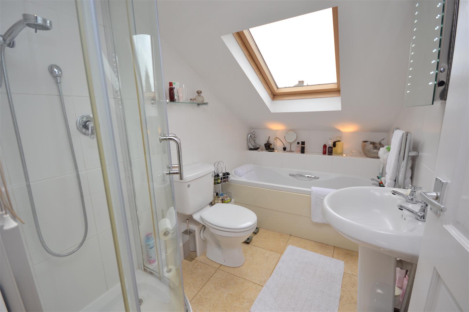 Main Bathroom - 2.77m x 1.63m (9'1" x 5'4") - The main bathroom is positioned in the middle of the two first floor bedrooms, tiled to the walls and floor and fitted with a four piece white suite with chrome fittings including a wash hand basin, a wc with soft close seat, panelled bath set into the lower pitch of the roof/ceiling with a Velux skylight window above and a separate corner shower with a curved sliding enclosure and chrome thermostatic shower fitment. Recessed ceiling downlights and extractor fan, chrome heated towel rail, shaver point and a wall cabinet with a backlit mirror.