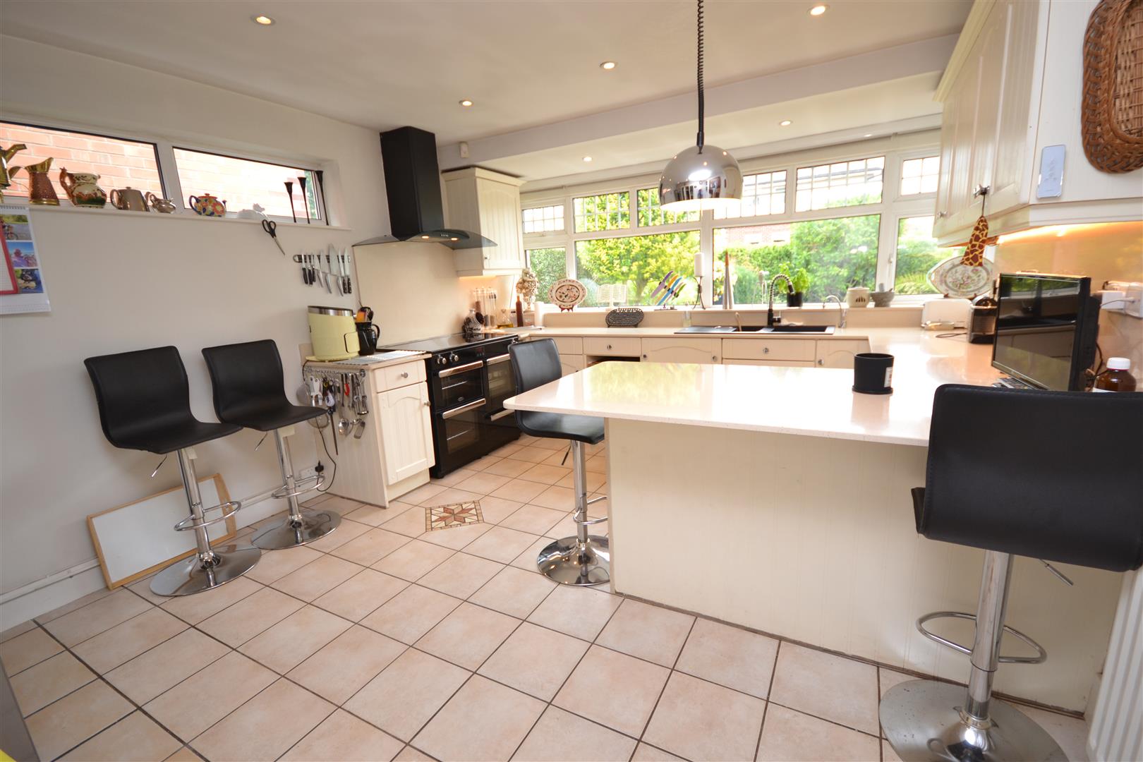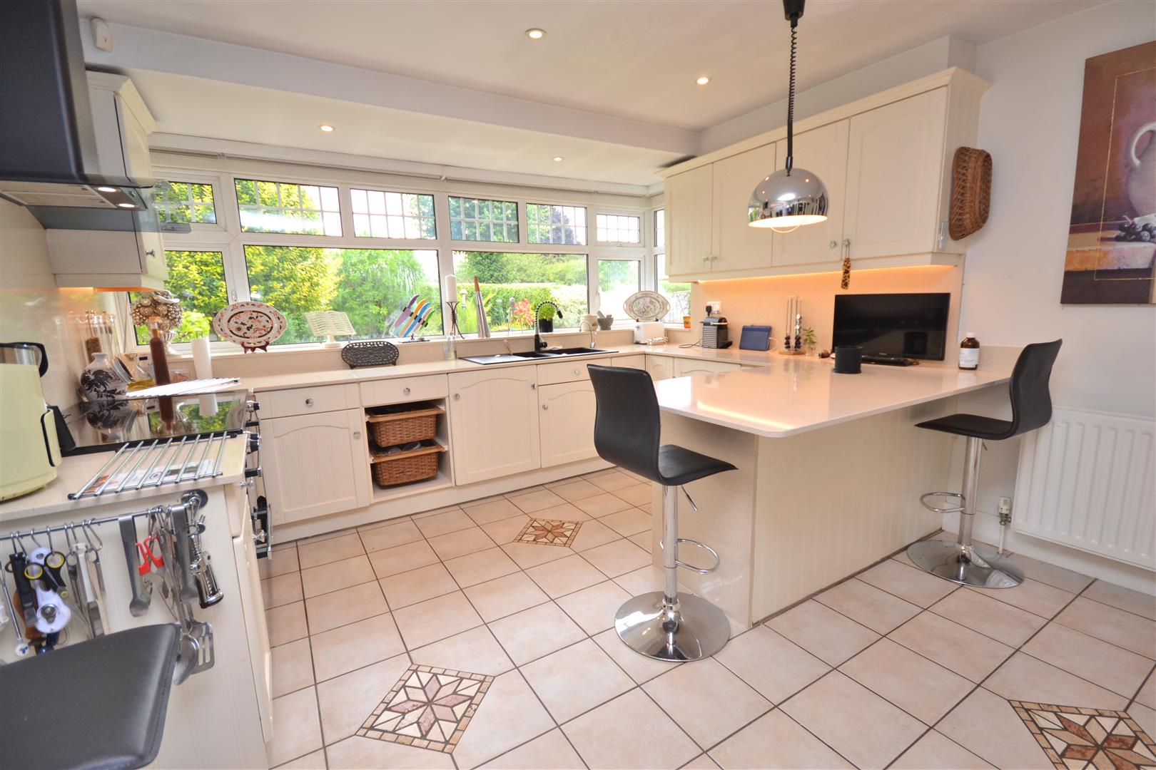 Breakfast Kitchen - 4.67m x 3.73m (15'4" x 12'3") - A fantastic feature to the property is this breakfast kitchen fully fitted with a range of wall and base cabinets and drawers finished with quartz worktops with a slim profile continuing into a breakfast bar with matching upstands and splashbacks, built-in full size dishwasher and a contemporary one and a half bowl sink unit with waste disposal and boiling hot and cold filtered tap. Further appliance spaces including a recess for a full electric range cooker, with double ovens and grill and an induction hob with a canopy extractor above. A large bay window to the front fitted with electric and remote controlled blinds, recessed ceiling downlights, tiled flooring, tv point and a further high level window to side,.