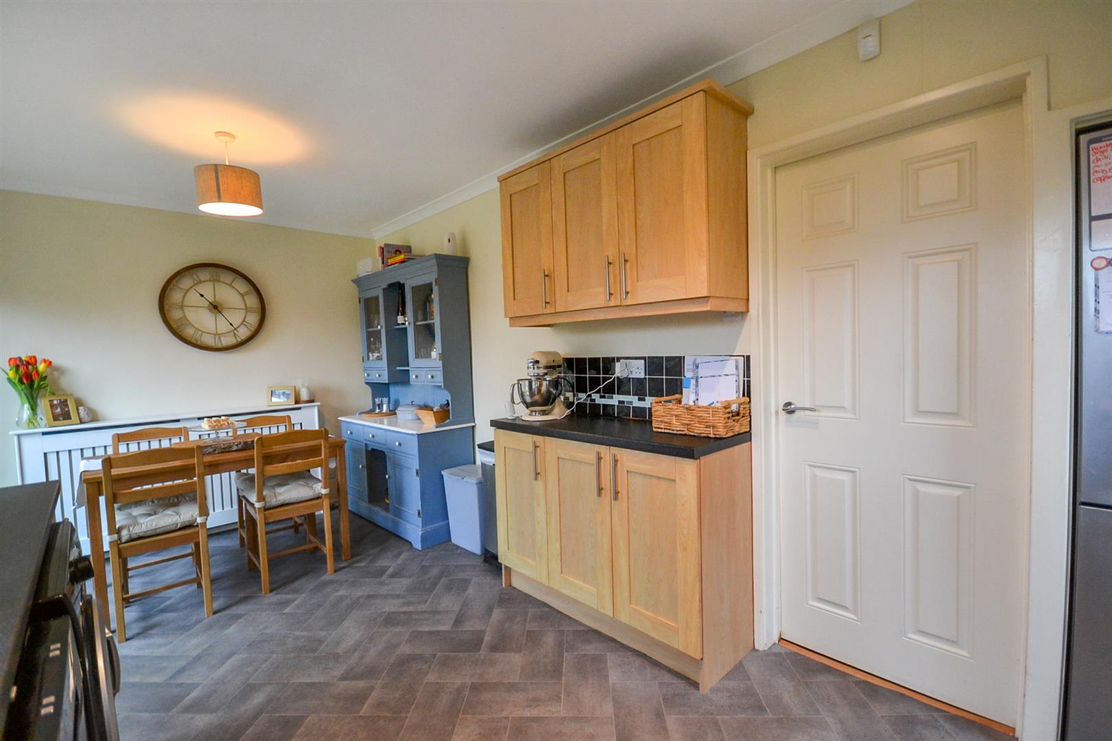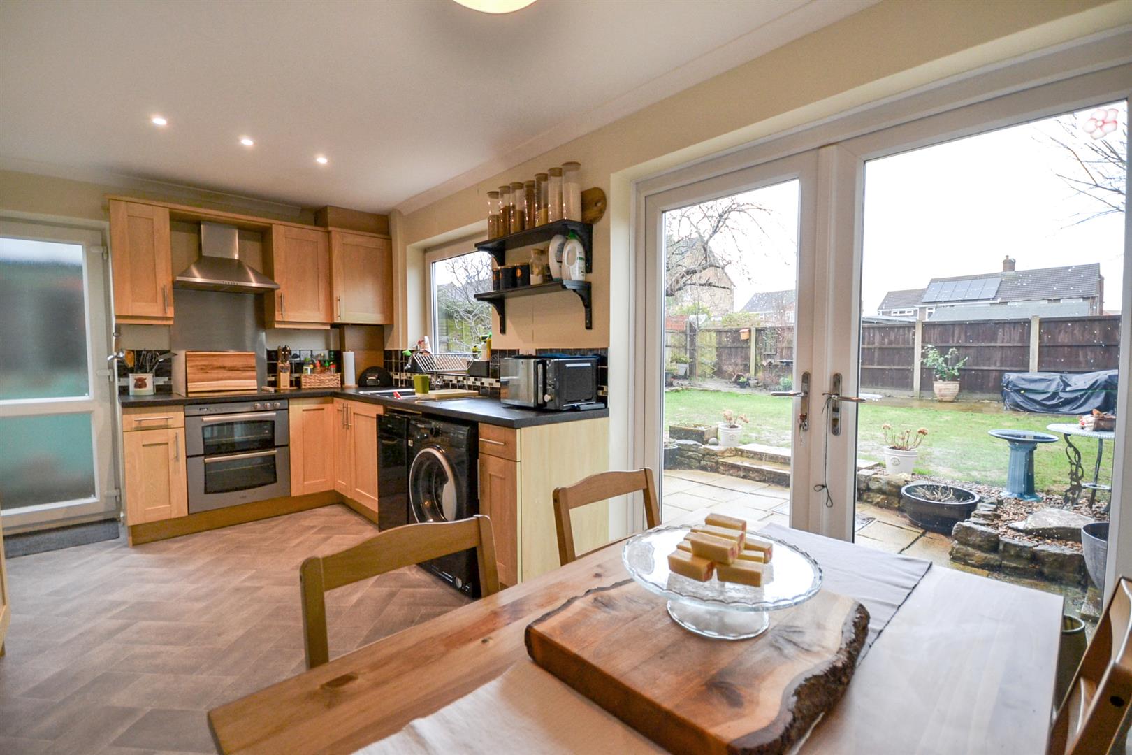 The dining kitchen spans the full width of the rear of the property and is fitted with attractive shaker-style units. French doors open directly onto the rear garden, making it an ideal space for both everyday family living and entertaining.