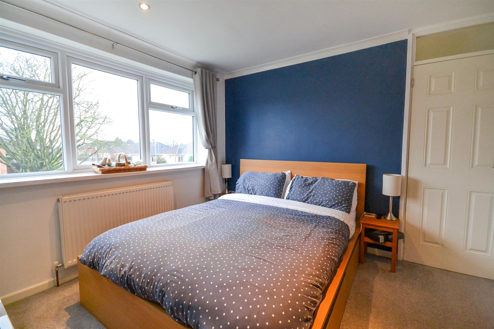 Bedroom One - A double bedroom with coving and spotlights to the ceiling, a central heating radiator, a uPVC double glazed window to the front aspect and a built-in double wardrobe with hanging rail and cupboards above.