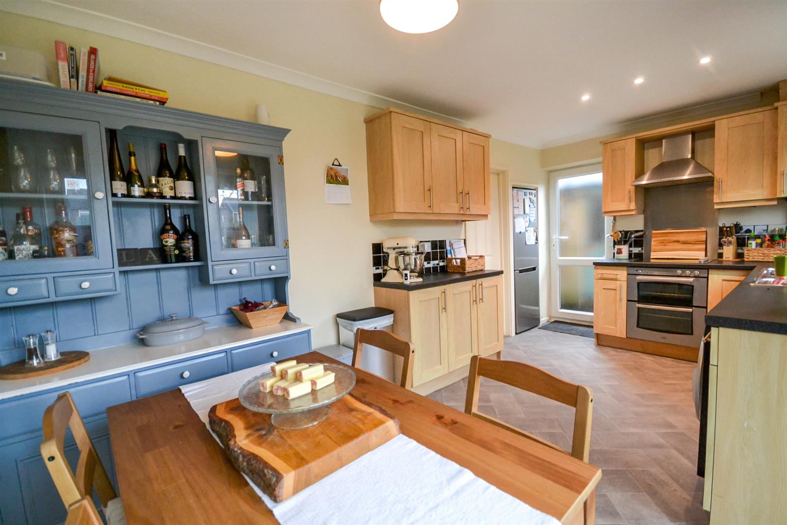 Dining Kitchen - Situated across the rear of the property, the dining kitchen is fitted with a range of Shaker-style base and wall cabinets complemented by rolled-edge worktops and tiled splashbacks. There is an inset 1.5 bowl stainless steel single drainer sink, along with a built-in double oven, four-zone electric hob and chimney-style extractor hood over.