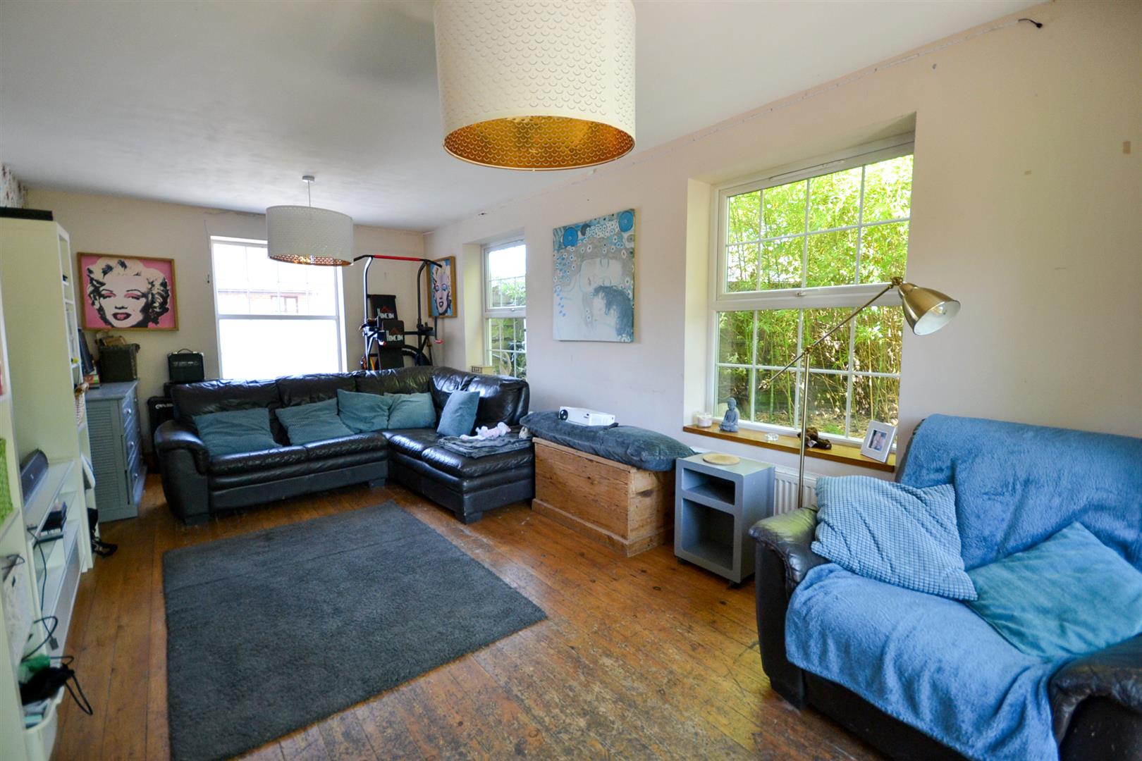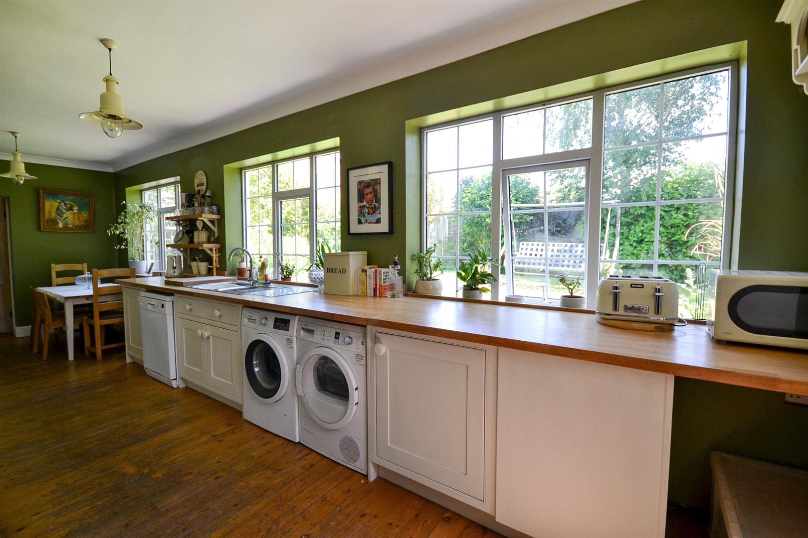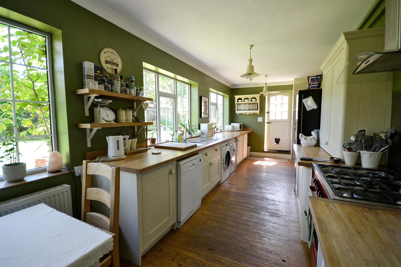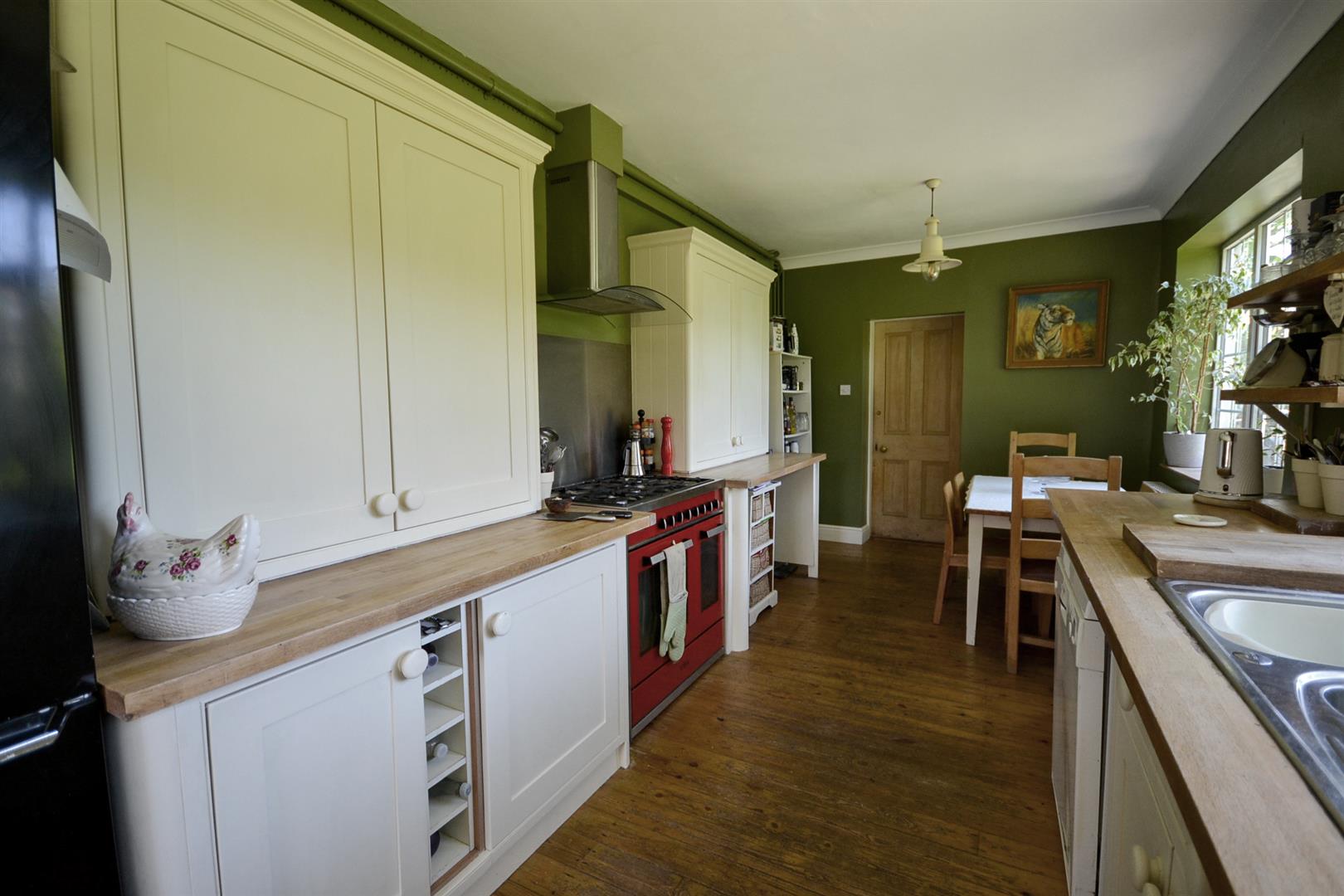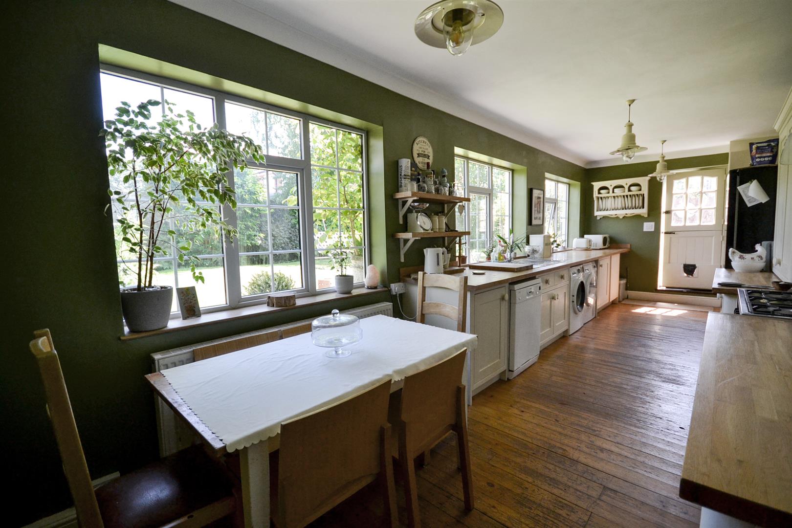 Dining Kitchen - A spacious dining kitchen fitted with a range of Shaker base and walls cabinets with solid timber butchers block worktops and an inset 1.5 bowl single drainer sink with mixer tap. There is space for an abundance of appliances including recess for a range style cooker with a fixed stainless steel splashback and chimney extractor hood over. Plumbing for a washing machine and a dishwasher, stripped wooden floorboards throughout, three uPVC double glazed windows overlooking the rear garden, space for a dining table and chairs. There is a central heating radiator, a floor to ceiling fitted cupboard houses the Main combination boiler and provides storage. A stable door onto the gardens and a stripped pine door into the family room.
