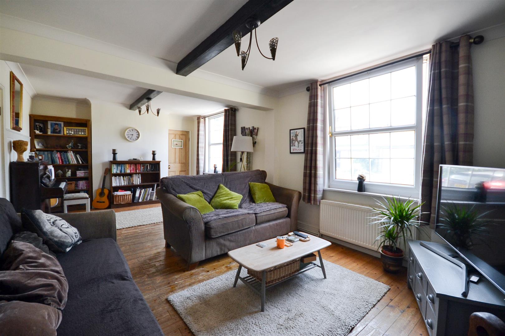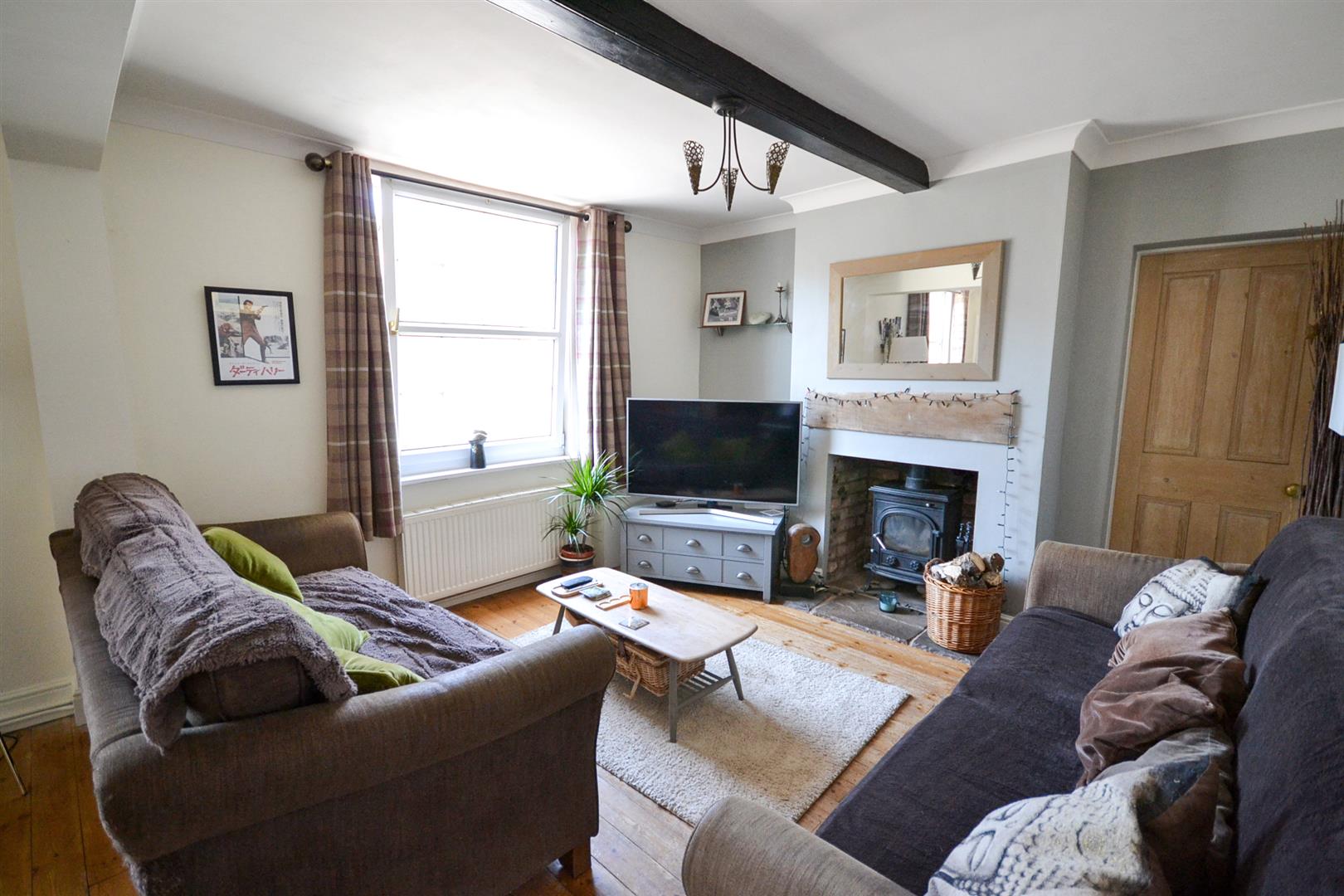 Lounge Diner - A spacious reception room with stripped wooden floorboards, two central heating radiators, two uPVC double glazed windows to the front elevation, coved ceiling and exposed timber ceiling beam plus panelling to some of the walls and a feature fireplace with raised oak mantel and a York stone hearth housing a log burner. A stripped pine door leads into the rear hallway.