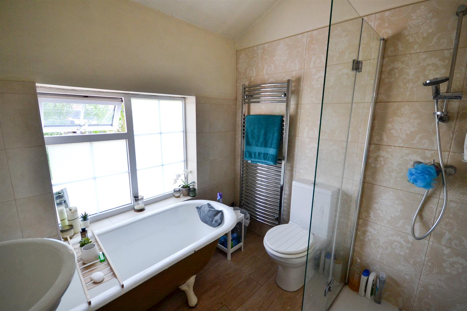 First Floor Bathroom - A four piece bathroom fitted with a dual flush toilet and a counter topped vanity wash basin with mixer tap. There is a shower enclosure with glazed folding door and mains fed shower plus a freestanding roll-top cast iron bath with hot and cold taps. Wood effect tiling to the floors, tiling to the walls for splashbacks, an extractor fan, a chrome towel radiator and a uPVC double glazed obscured window to the rear aspect.