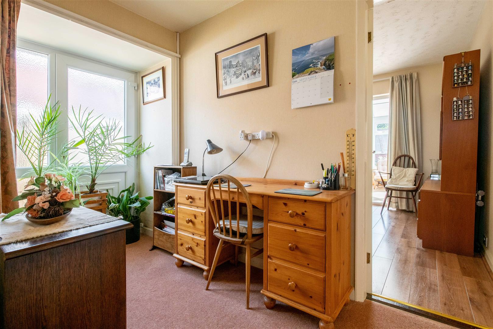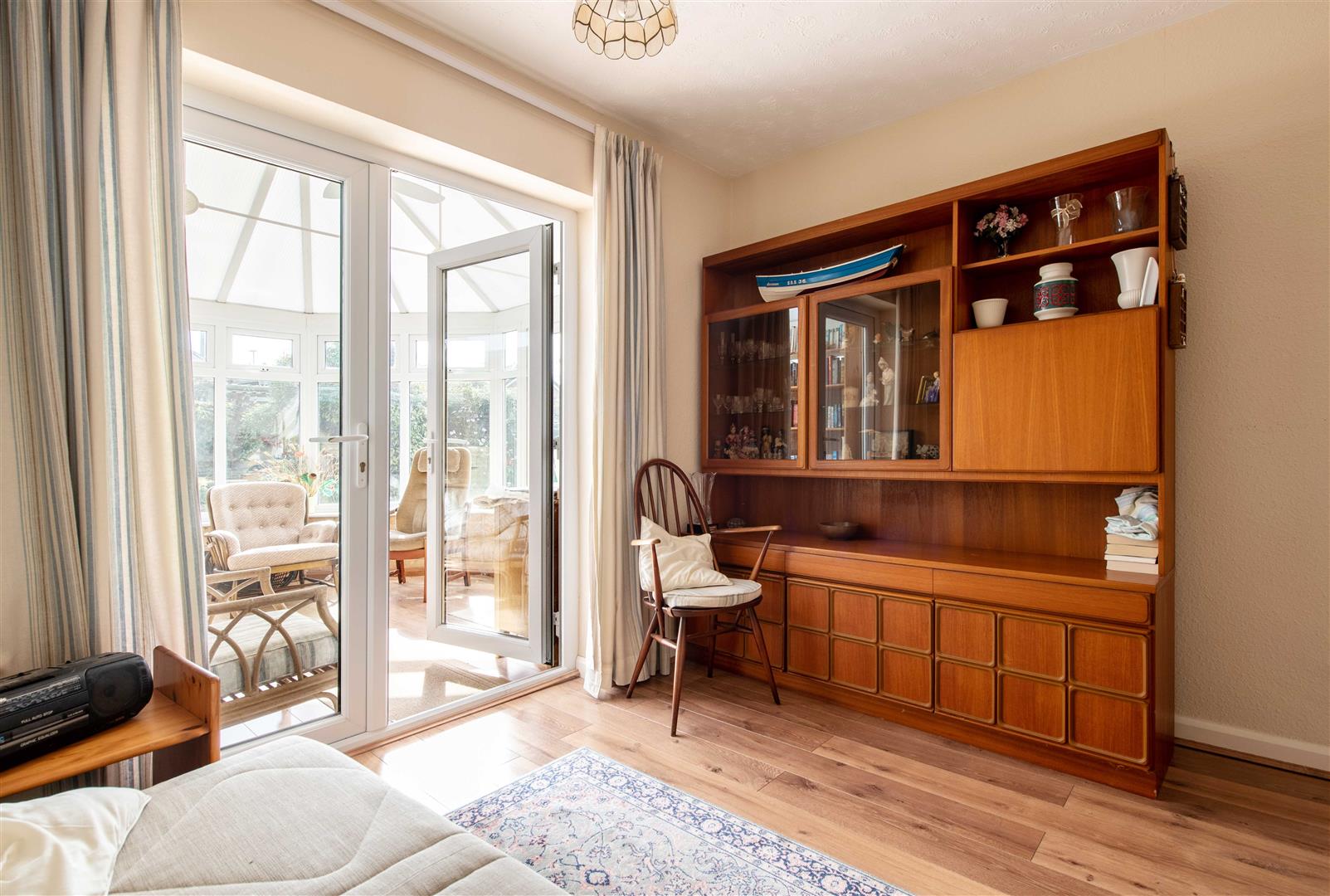 Bedroom Two - Currently used as a sitting room with laminate flooring, a central heating radiator and uPVC double glazed French doors into the conservatory.