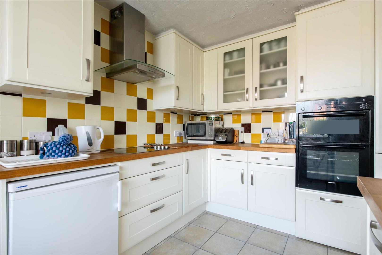 Kitchen - Fitted with a range of cream fronted Shaker style base and wall cabinets with underlighting, Butcher's block worktops and tiled splashbacks, an inset 1.5 bowl stainless steel single drainer sink with mixer tap and built-in appliances including an eye level double oven by Siemens plus a four zone electric hob and chimney extractor hood over. There is space for further appliances including plumbing for a washing machine. Useful larder style storage cupboard with shelving, tiled flooring, a central heating radiator, uPVC double glazed windows to the front and side aspects and a uPVC double glazed door to the side beneath the carport.
