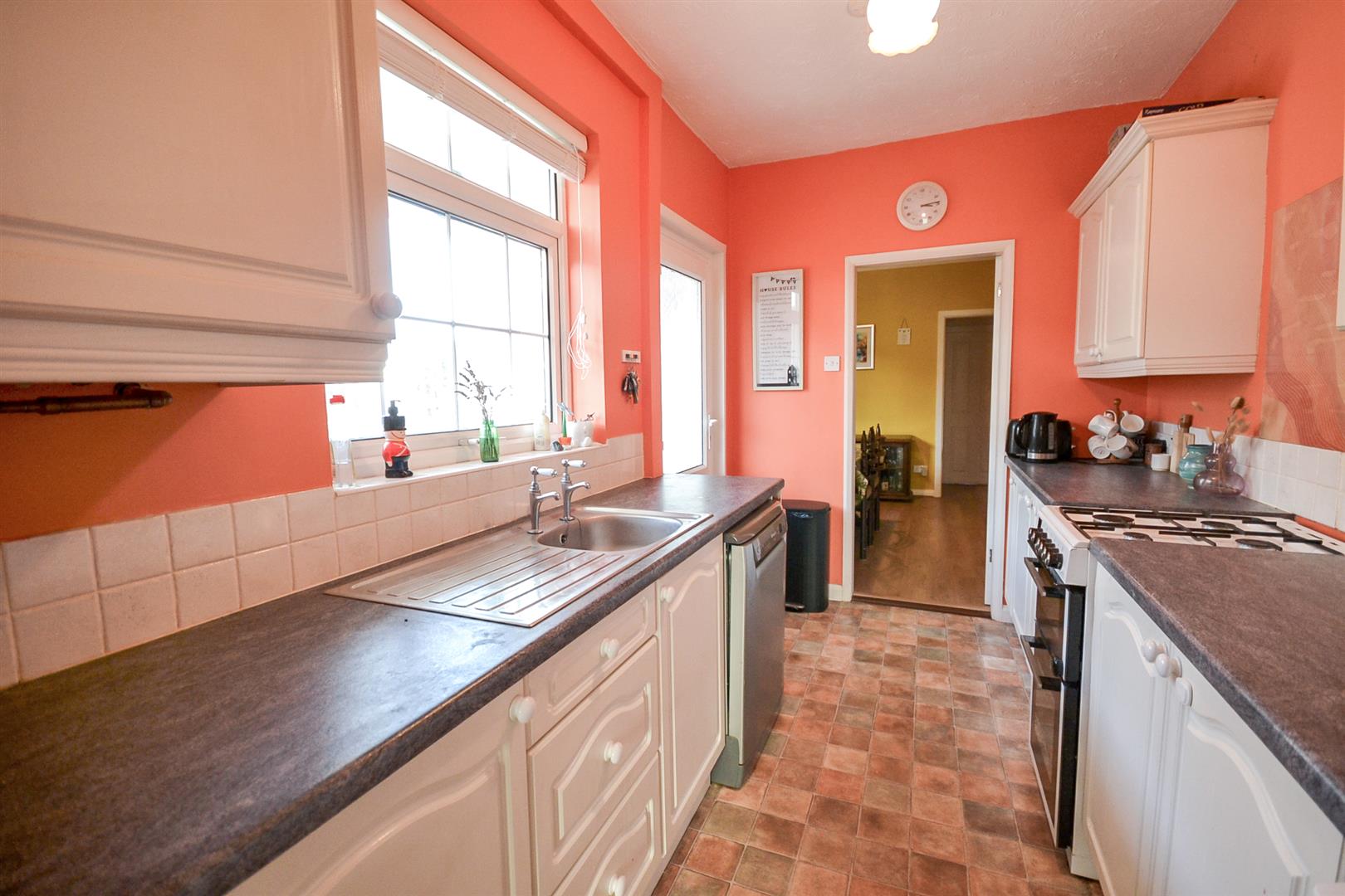 The property is well proportioned and includes two reception rooms, currently arranged as a lounge to the front and a dining room to the rear, which flows seamlessly into the kitchen with a side porch providing additional access.