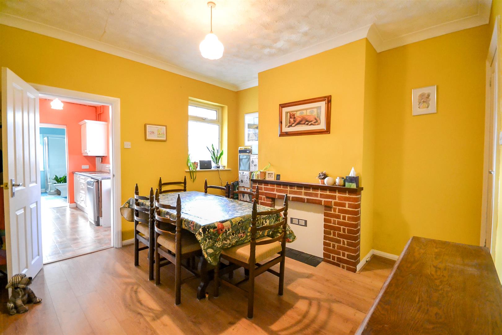 Dining Room - A well proportioned reception room with laminate flooring, a central heating radiator, coved ceiling, a uPVC double glazed window to the conservatory, a door and staircase rising to the first floor and a fireplace with brick surround.