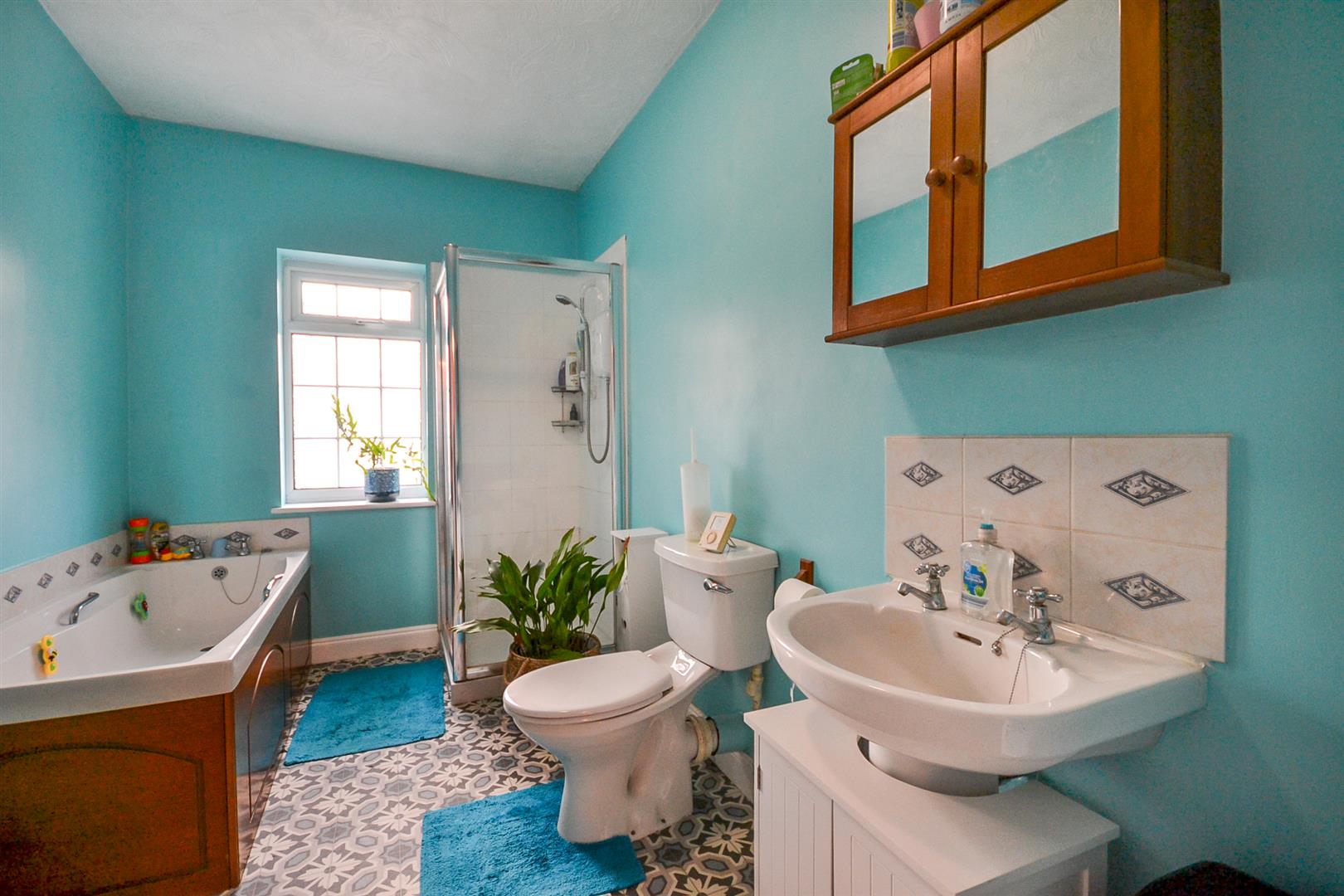 Ground Floor Bathroom - A good sized four piece ground floor bathroom including a pedestal wash basin with hot and cold taps and a close coupled toilet. There is a panel sided bath with hot and cold taps as well as a shower enclosure with glazed door and Triton electric shower. There is tiling for splashbacks, a central heating radiator and a uPVC double glazed obscured window to the rear aspect.