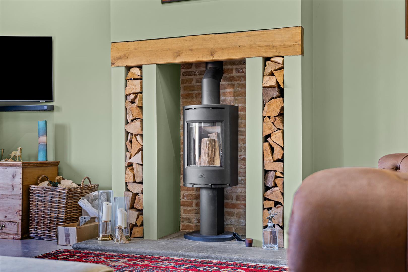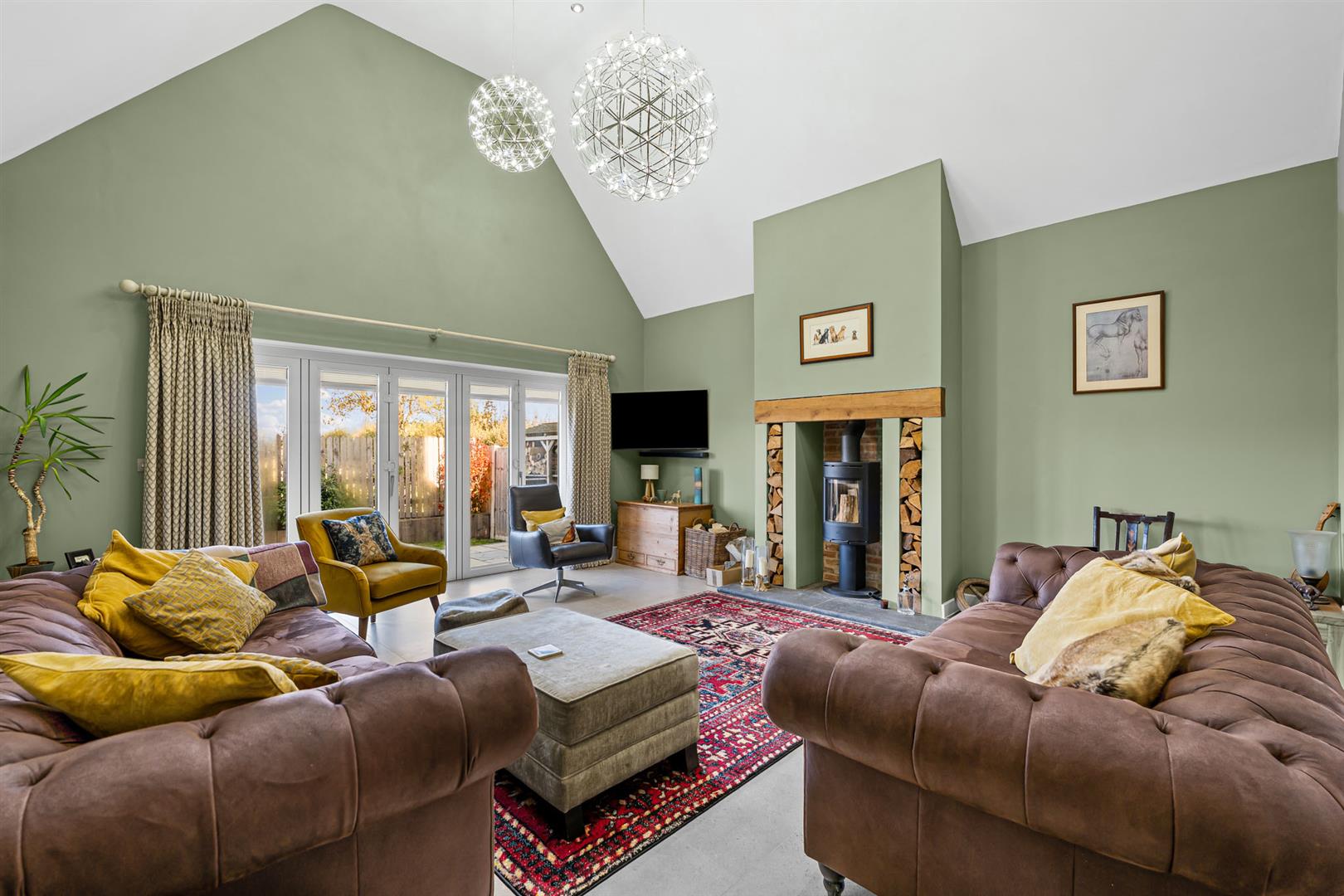 Sitting Room - 5.49m x 5.13m (18' x 16'10") - A well proportioned reception affording a fantastic, cathedral vaulted ceiling, the focal point to the room being chimney breast with stone hearth, exposed brick back, inset contemporary log burner and alcoves to the side, continuation of tiled floor and deep skirtings. The room benefits from a dual aspect with double glazed sash window and bifold doors giving fantastic views across adjacent fields and the escarpment beyond.