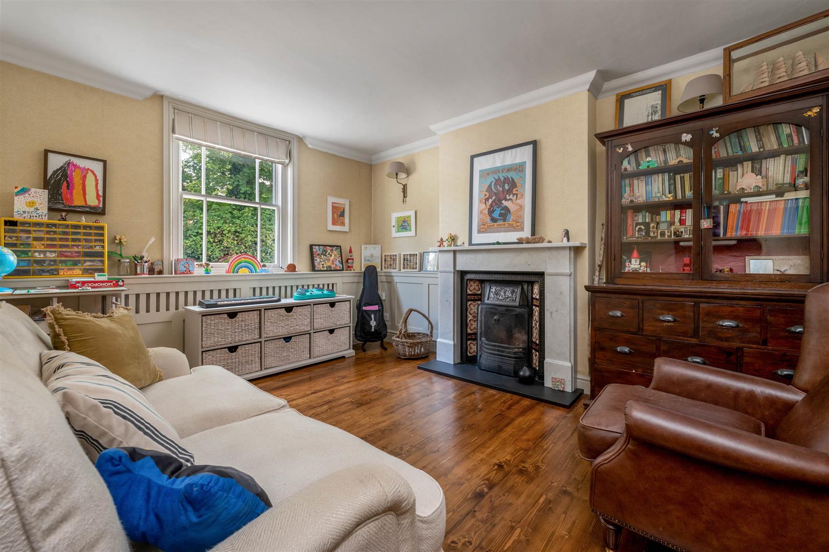 Sitting Room - 4.37m x 3.45m (14'4" x 11'4") - An attractive room having double glazed sash window to the front, the focal point to the room being a chimney breast with marble fire surround, slate hearth and inset cast iron fireplace with tiled inserts, alcoves to the side, part panelled walls, high coved ceiling, central heating radiator behind feature cover and attractive exposed floor boards.