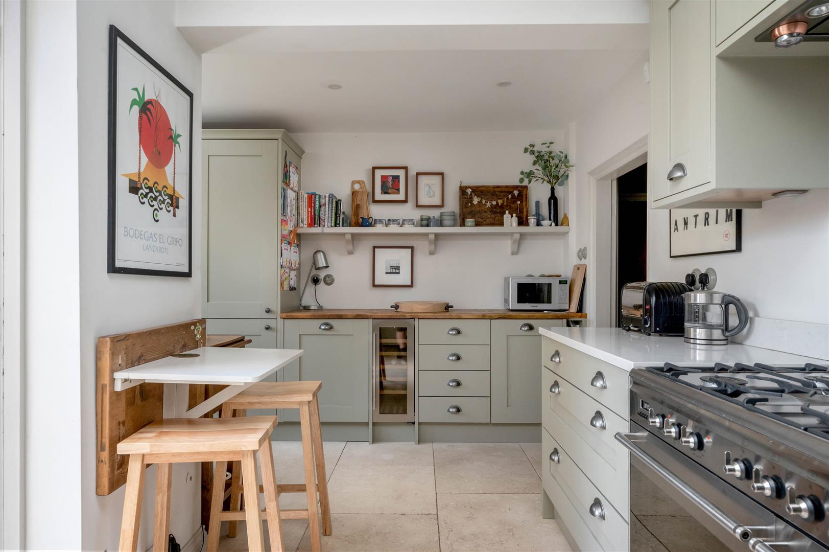 L Shaped Breakfast Kitchen - 5.13m x 4.37m max (16'10" x 14'4" max) - An attractive light and airy space benefitting from windows to two elevations as well as French doors leading out into the rear garden. The kitchen is tastefully appointed with a generous range of Shaker style wall, base and drawer units finished in heritage style colours with a combination of work surfaces, the main run being quartz, having undermounted Belfast style sink with brush metal swan neck mixer tap and tiled quartz splash backs, further butcher's block effect work surface with built in units beneath and integrated wine cooler, further integrated appliances including slim line dishwasher, full height fridge freezer, separate under counter freezer and pull out recycling drawer, space for free standing range, continuation of the Travertine tiled floor and deep skirtings, inset downlighters to the ceiling.