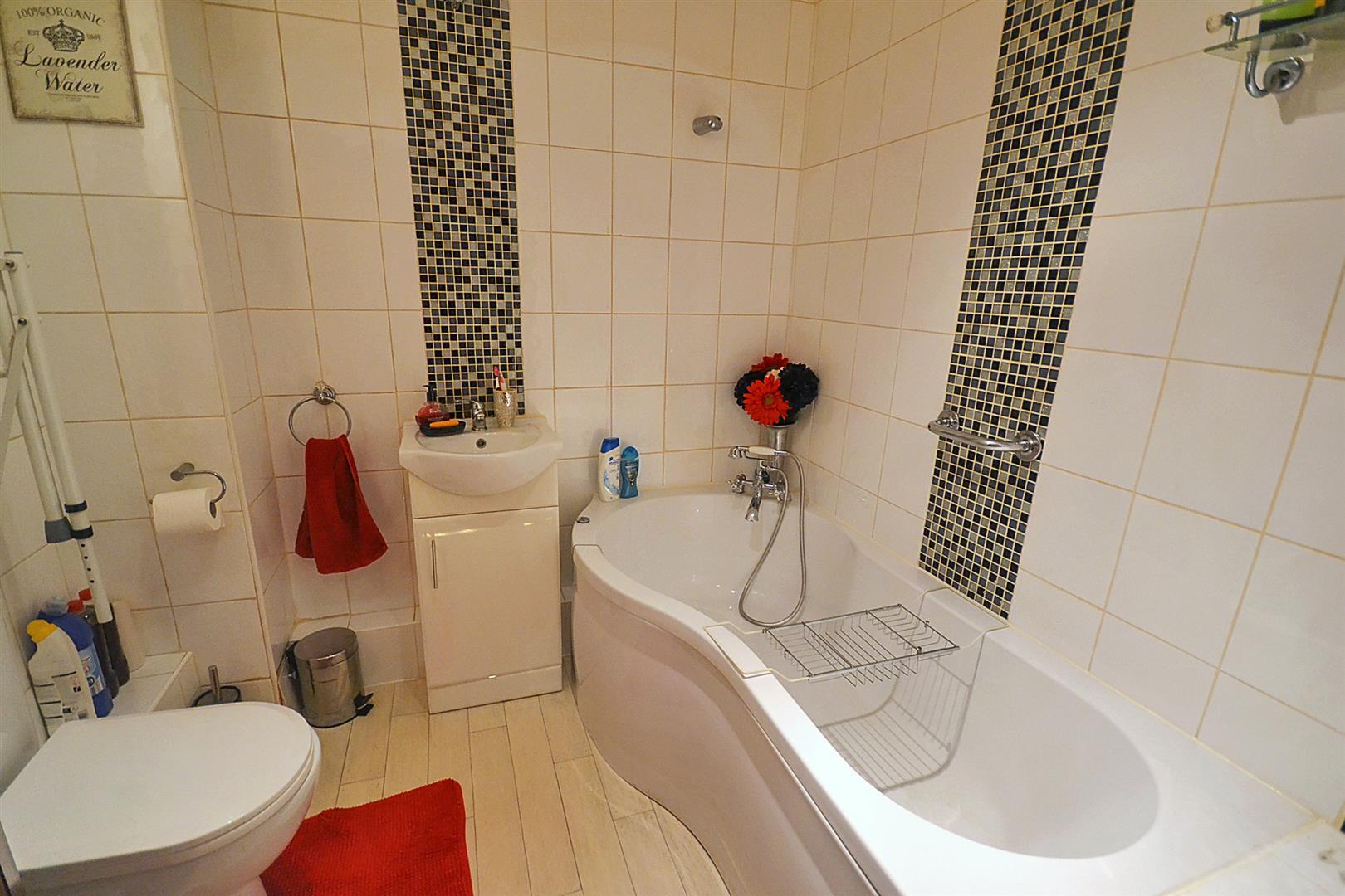 En-Suite Bathroom - Fitted with a P shaped shower bath with mixer shower, vanity wash basin with mixer tap and cupboard below, toilet, radiator and extractor fan.