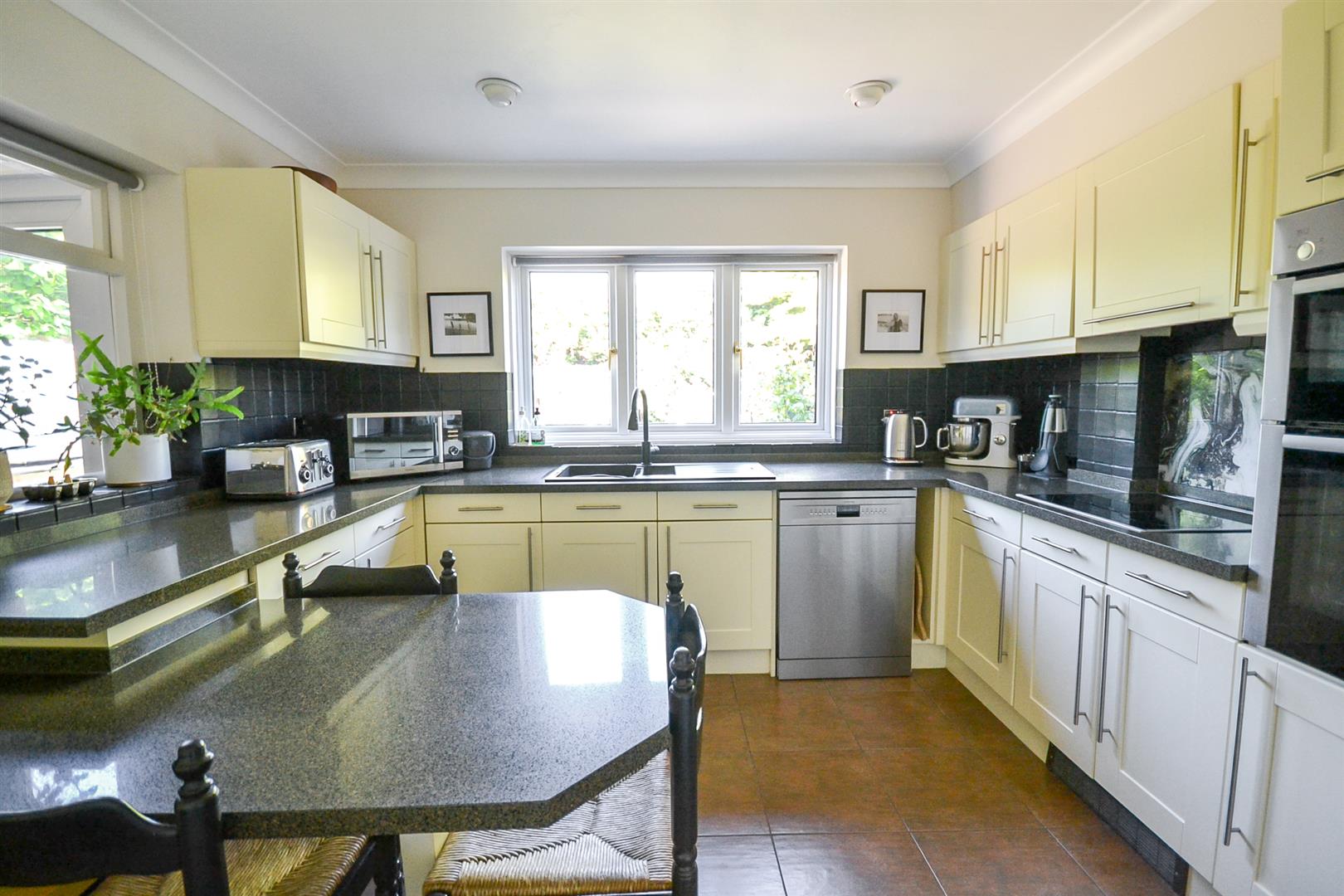 Kitchen - Fitted with a range of modern Shaker style base and wall cabinets with granite topped worktops and upstands, tiling for splashbacks, an inset 1.5 bowl composite sink with mixer tap and sprayhose plus a range of integrated appliances including an eye level double oven by Bosch, a four zone electric hob with concealed extractor hood over and space and plumbing for a dishwasher. There is tiled flooring with underfloor heating, a uPVC double glazed window overlooking the rear garden, two useful walk-in pantries, both with shelving and providing excellent storage.