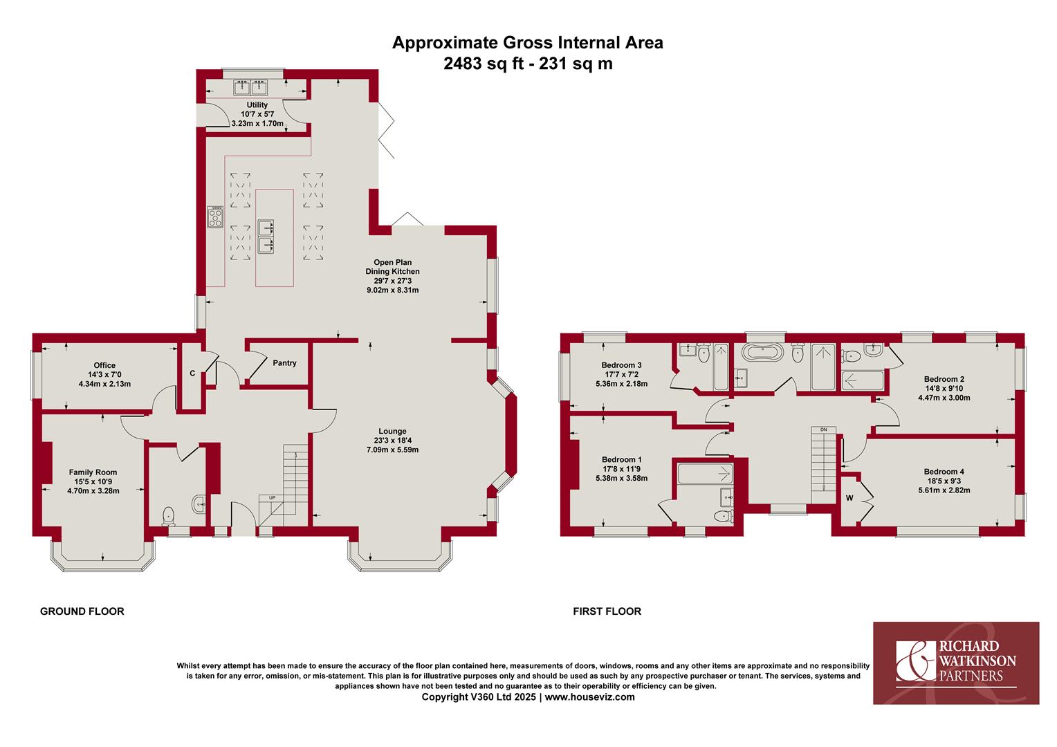 To the first floor are four double bedrooms, three of which benefit from luxurious en-suite bathrooms, complemented by a stylish four-piece family bathroom.
