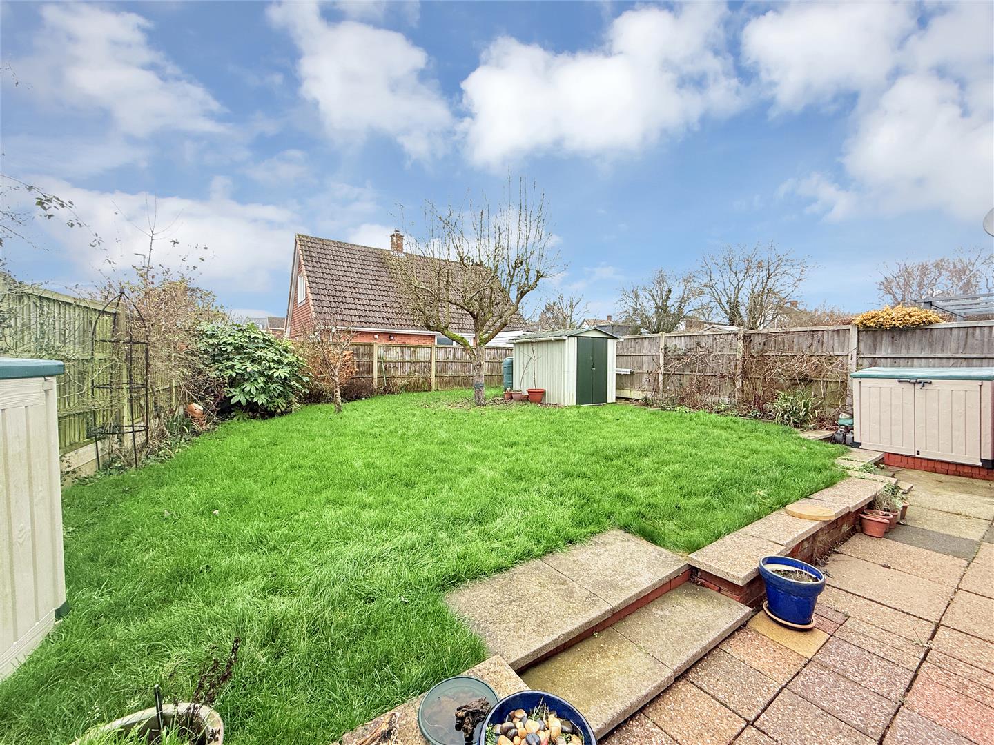 Outside - The property occupies a mature corner plot. To the front, a lawned garden sets the property back from the road, with gated side access leading to the rear. A single width driveway provides parking for at least three vehicles and leads to the attached garage, which has a metal up-and-over door and a courtesy door to the rear.