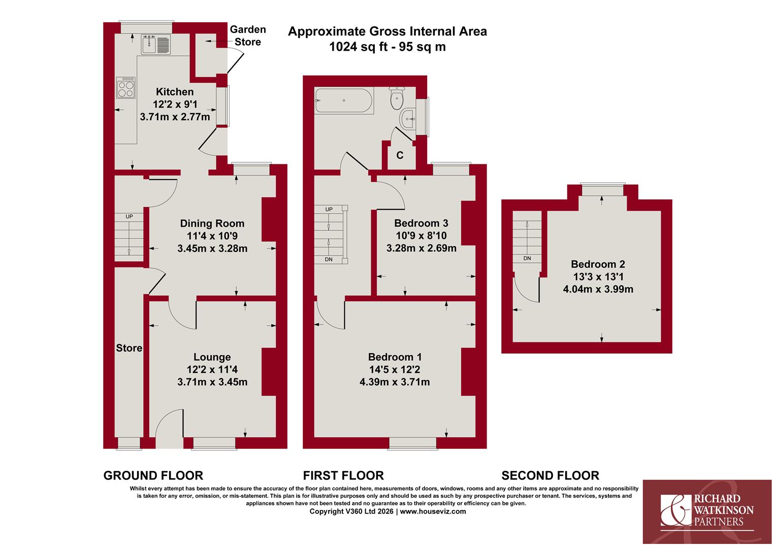 The well-proportioned layout includes a lounge, separate dining room, and a fitted kitchen to the ground floor. To the first floor are two double bedrooms and a generous family bathroom, with a further staircase leading to a large third bedroom on the second floor.