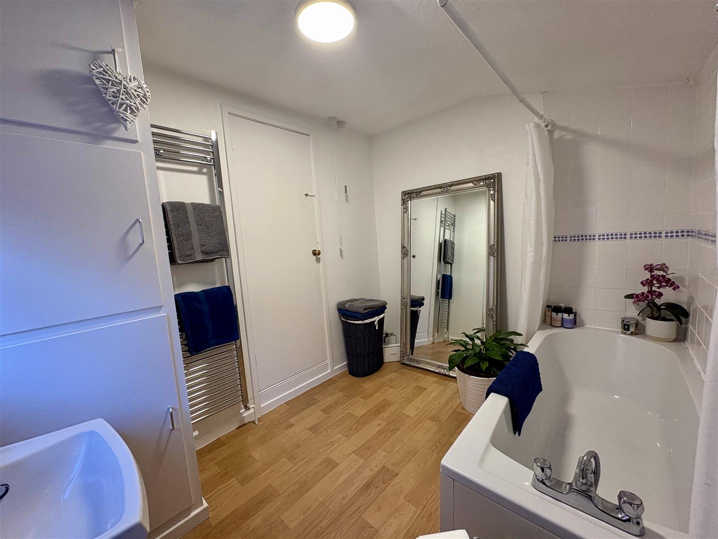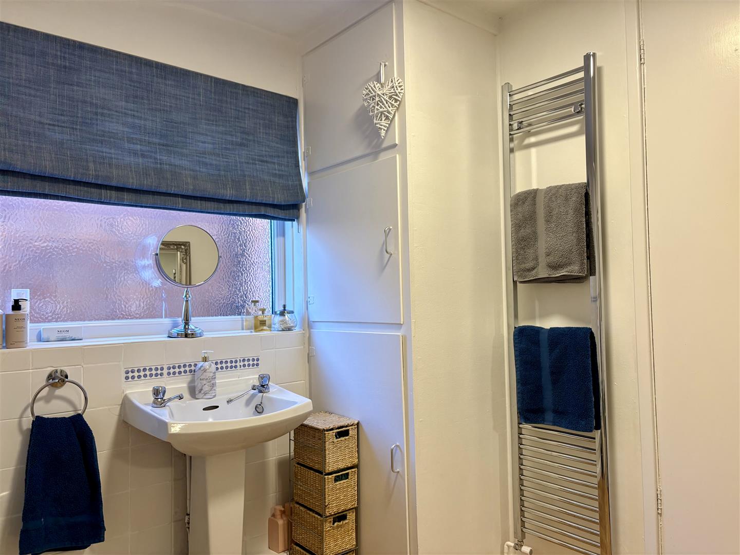 Bathroom - The bathroom is fitted with a white suite comprising a panelled bath with mixer tap and shower over, a wash hand basin and toilet. Additional features include a heated ladder-style towel radiator and a useful large shelved storage cupboard.
