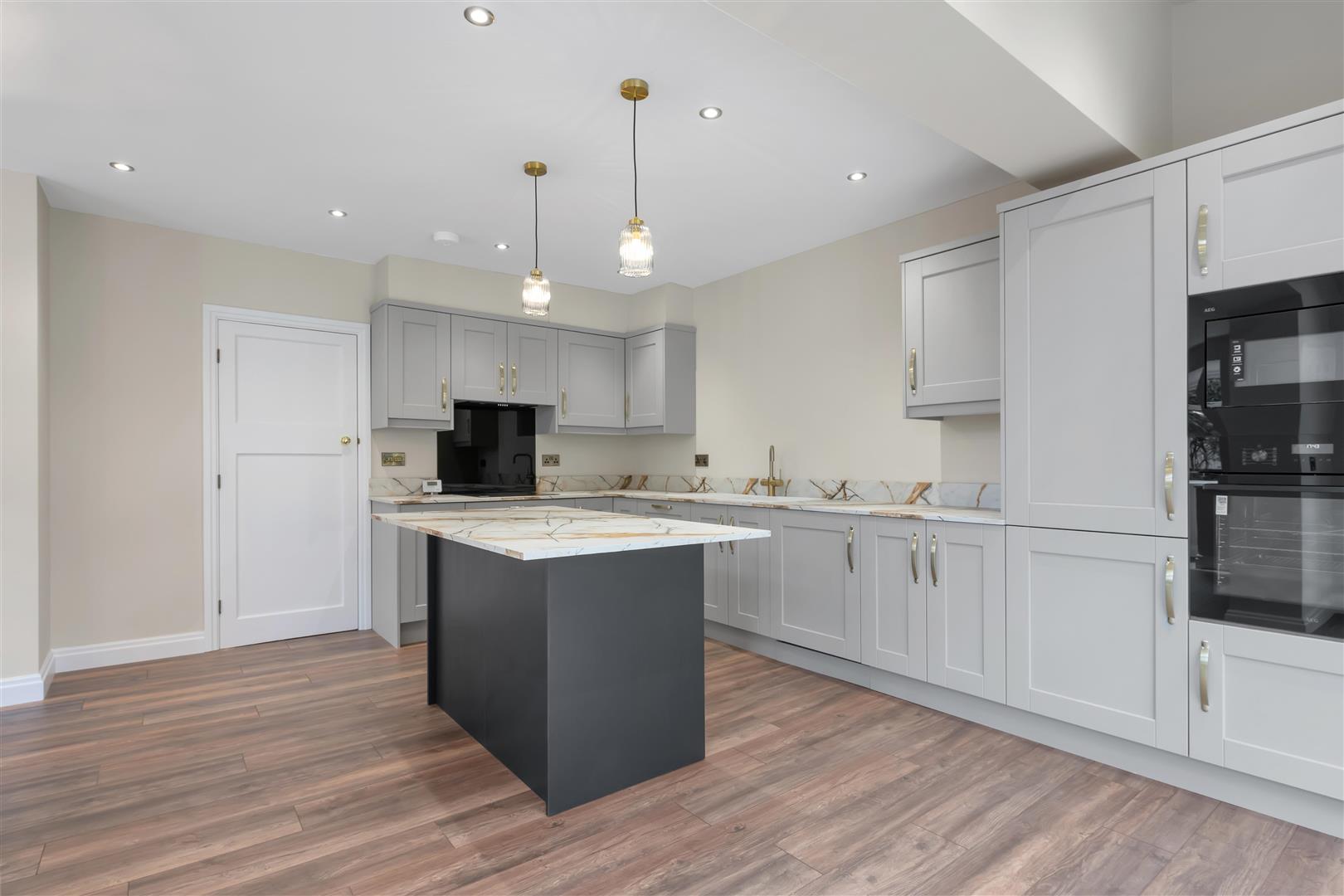 superb two-tone designer kitchen takes centre stage - complete with quality worktops, a full range of integrated appliances, and a central island with breakfast bar seating.