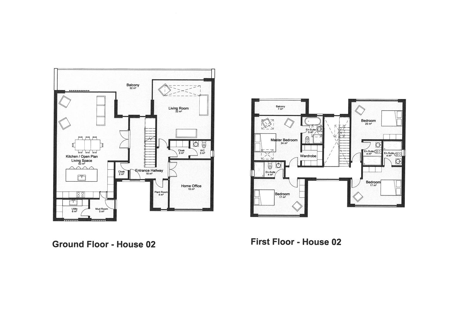 House 2 boasts 4,036 sq ft (375m2) arranged over three floors with a separate detached double garage with an adjoining store which provides a further 527 sq ft (49m2). The ground floor living accommodation comprises a stunning vaulted entrance hallway with double doors opening to a huge open plan living/dining/kitchen. There is a plant room, cloaks, WC, boot room, utility room, home office and a separate living room. There is a substantial 344 sq ft (32m2) balcony at ground floor level extending across the full width of the property overlooking the lower level terrace, rear garden and south facing open countryside beyond. The lower level ground floor provides a hallway, gym, home cinema/games room, bike store, plant room and a shower room. The lower ground floor configuration could be changed for alternative use such as additional bedroom or granny annex. The vaulted first floor galleried landing enjoys the best of the south facing views, together with lovely views over Coxmoor golf club to the north. There are four large bedroom suites each with vaulted ceilings and an en suite. The master bedroom has an en suite bathroom, a walk-in wardrobe and a 7m2 balcony.