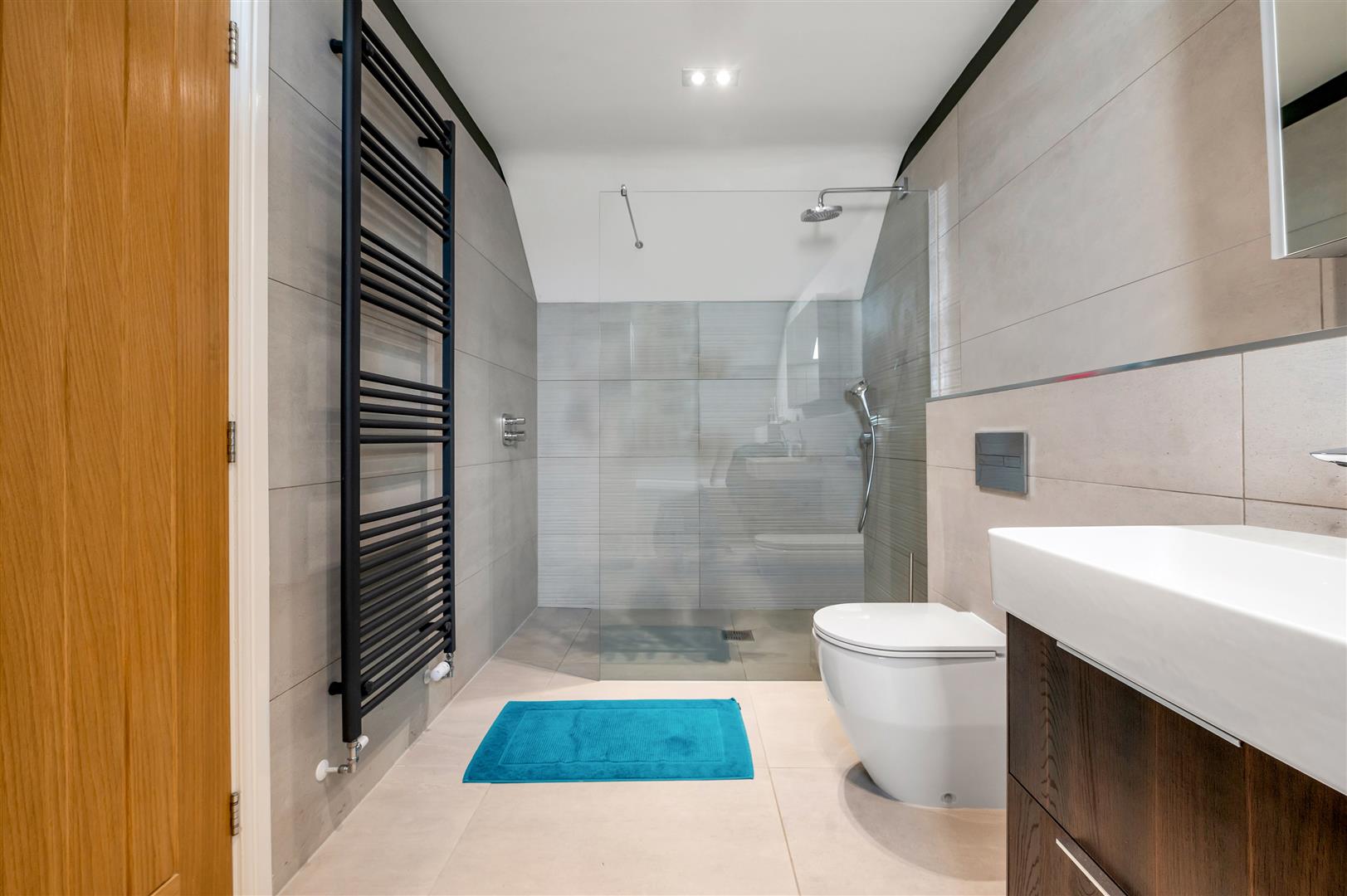 Ensuite Bathroom - 4.93m x 1.91m (16'2 x 6'3) - Appointed with a contemporary suite comprising large shower wet area with glass screen and wall mounted shower handset with rainwater rose over, tile panelled sunken bath with chrome mixer tap and integrated shower handset, twin vanity units with inset Laufen wash basins, low flush wc with concealed cistern and tiled vanity surface over, contemporary towel radiator, inset downlighters to the ceiling, skylight to the rear.