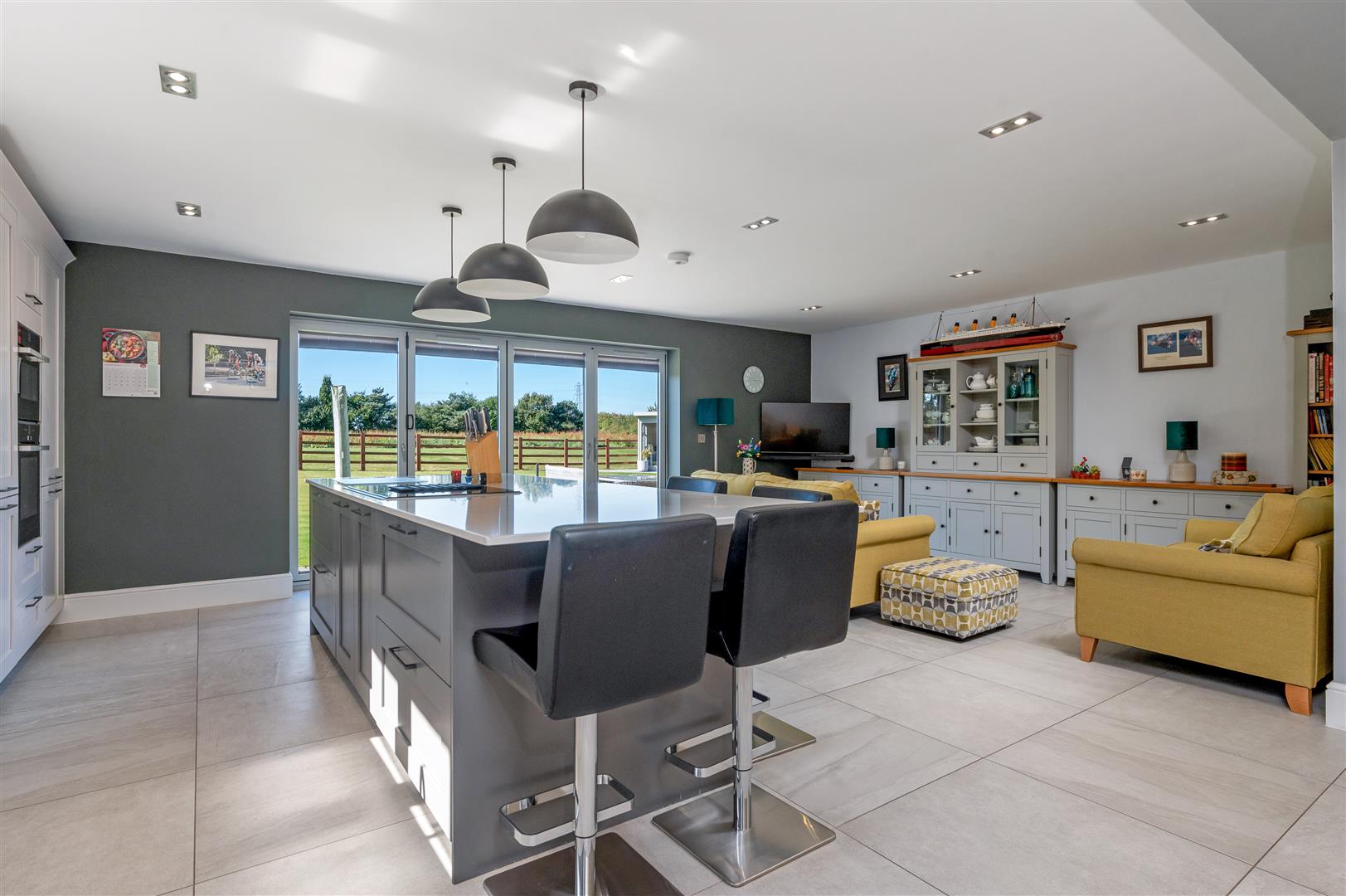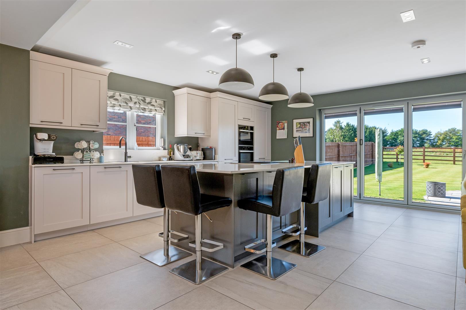 Living / Dining Kitchen - 7.26m x 7.32m max (23'10 x 24'0 max) - A superb open plan everyday living/entertaining space flooded with light having double glazed windows to the side and a run of bi-fold doors at the rear leading out onto the garden. The kitchen is appointed with a generous range of contemporary solid wood painted wall, base and drawer units by German company Hacker, complementing central island unit, Silestone preparation surfaces with inset sink. Integrated appliances include induction hob with down-draught extractor, Neff fan assisted oven, combination microwave, fridge and freezer, dishwasher, pull out butler's pantry, inset downlighters to the ceiling and three pendant lights above the island.