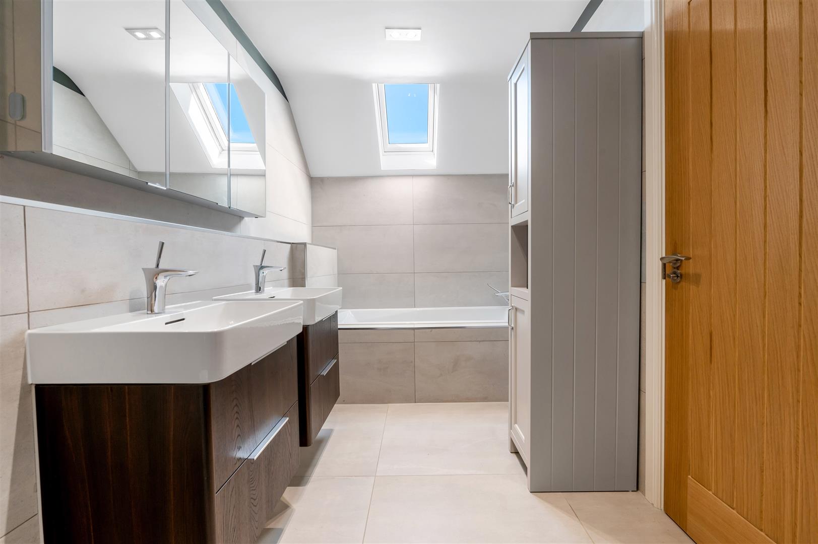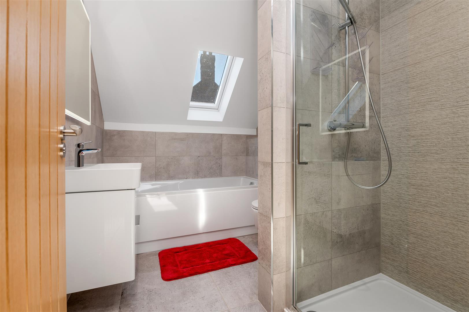 Family Bathroom - 2.79m x 2.08m (9'2 x 6'10) - Appointed with a contemporary suite comprising shower enclosure with wall mounted mixer with rainwater rose over, panelled bath with corner mounted mixer tap, wall mounted Laufen vanity unit with inset wash basin, tiled splashbacks and floor, towel radiator, pitched ceiling with inset downlighters and skylight.